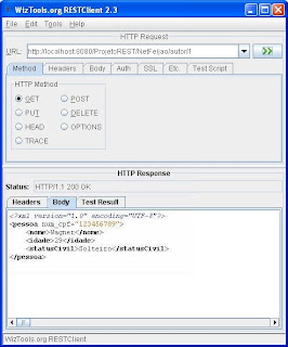 } Listagem 05 - Serviço RESTful cujo retorno é uma classe JAXB.Ao fazermos o consumo deste serviço RESTful, vamos perceber que a conversão é feita automaticamente pelo entity provider padrão para XML (veja o teste na Figura 05, utilizando a ferramenta RESTClient). De maneira inversa poderíamos criar um serviço RESTful para receber requisições PUT e receber como parâmetro de entrada do método a classe PessoaBinding via HTTP Body. Conforme apresenta a listagem 06: